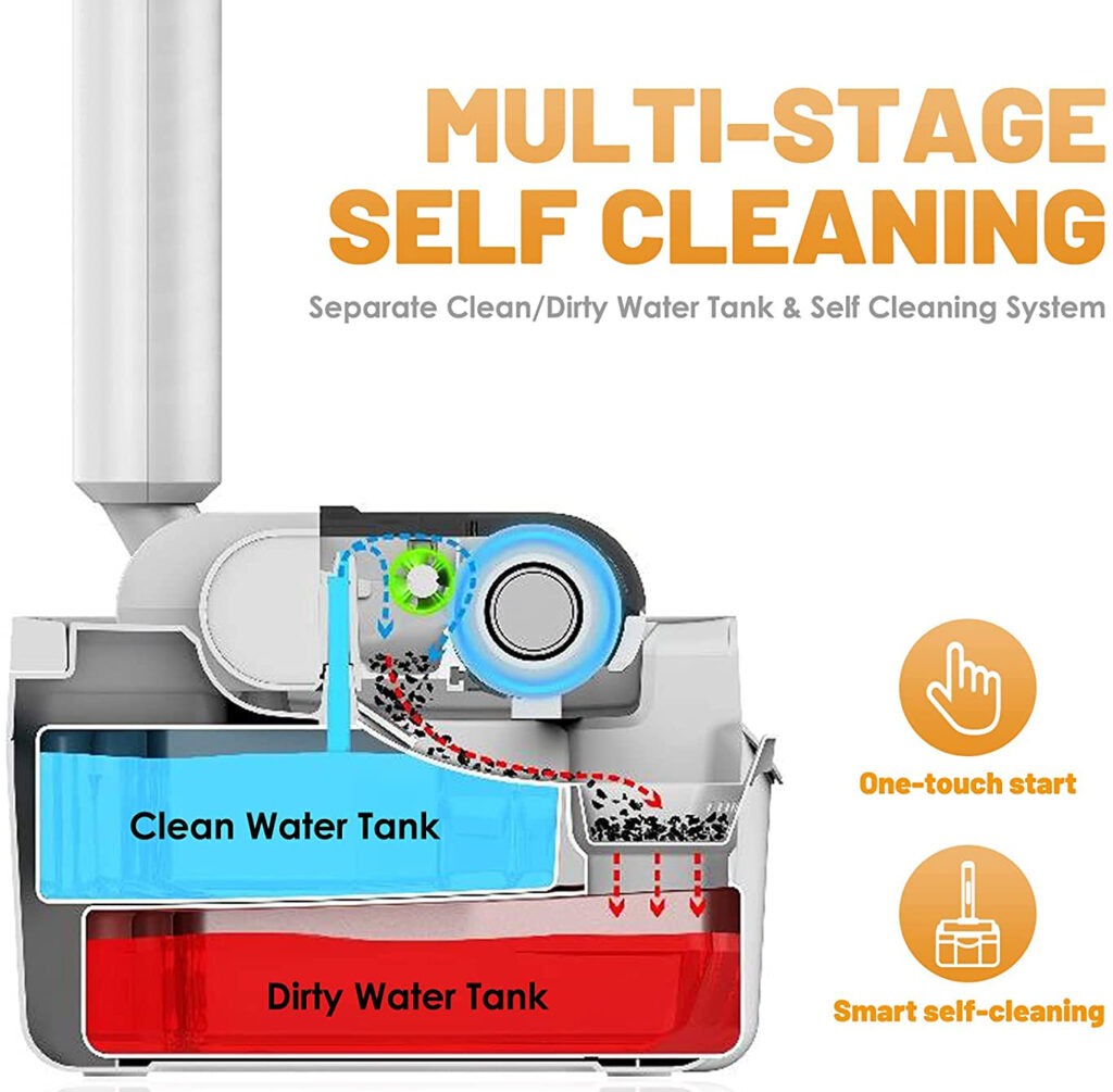 It adopts innovative technology. The internal small roller brushes the dirt off from the big roller to make the big roller always clean to sweep & mop the floor.