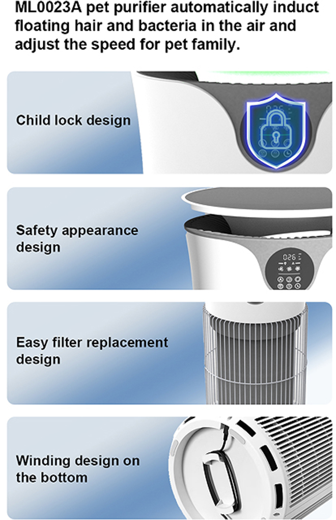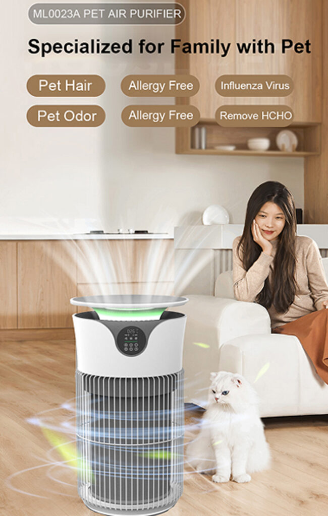 This air purifier is designed for air purification, deodorization and sterilization for home, office and hotel, especially for the family with pet. With patented turbo design and innovative filtraction system, this smart air purifier can effectively purify the air, remove the odor and allergy source and sterilize the bacteria in the air. It’s widely used for pet room, living room and bedroom and office etc.