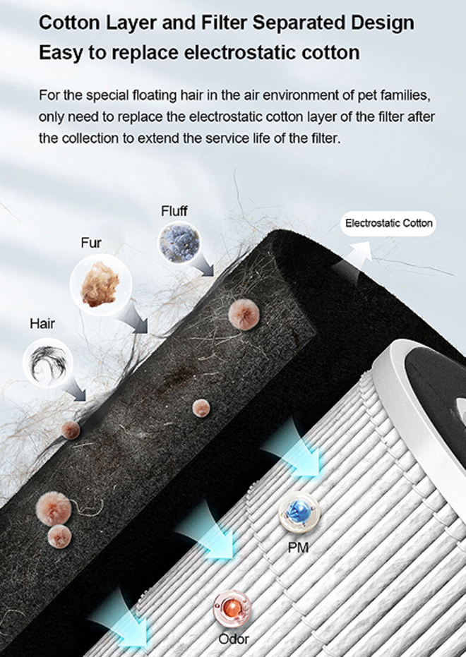 Made of electrostatic cotton layer, it can efficiently absorb the hair/fur & other allergic particles in the air. This prefilter is easy to be removed and replaced with new one, so as to extend the life of HEPA filter, reduce the maintenance cost of end-user