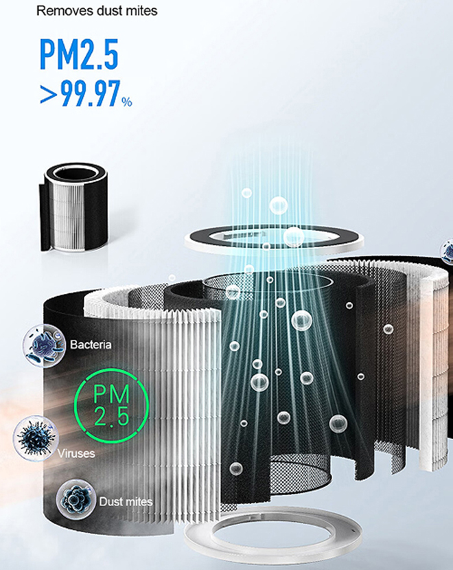 With pre-filter, HEPA filter and carbon filter for more efficient filtraction, it can filter 99.97% PM2.5 particles and remove the odor smell.